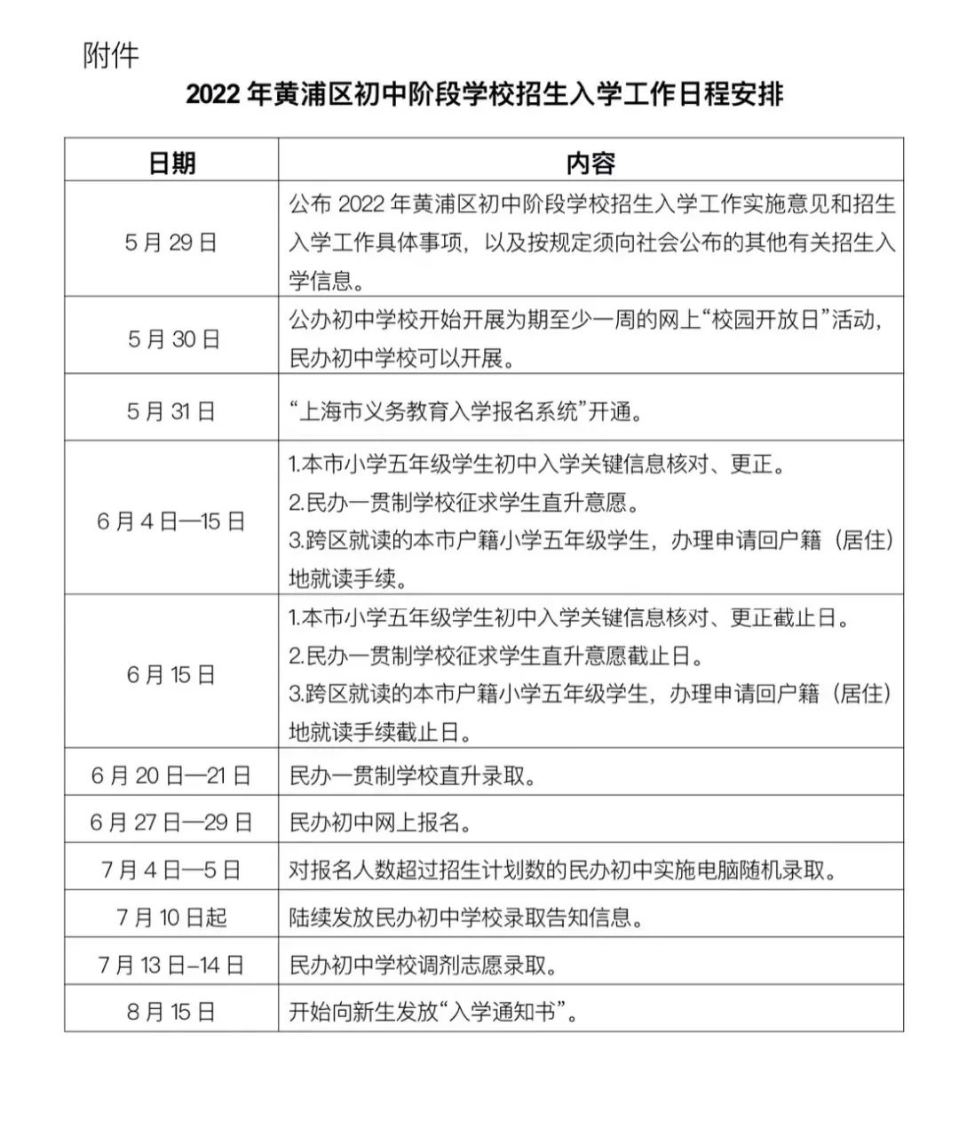 附件:《2022年黄浦区初中阶段学校招生入学工作日程安排》