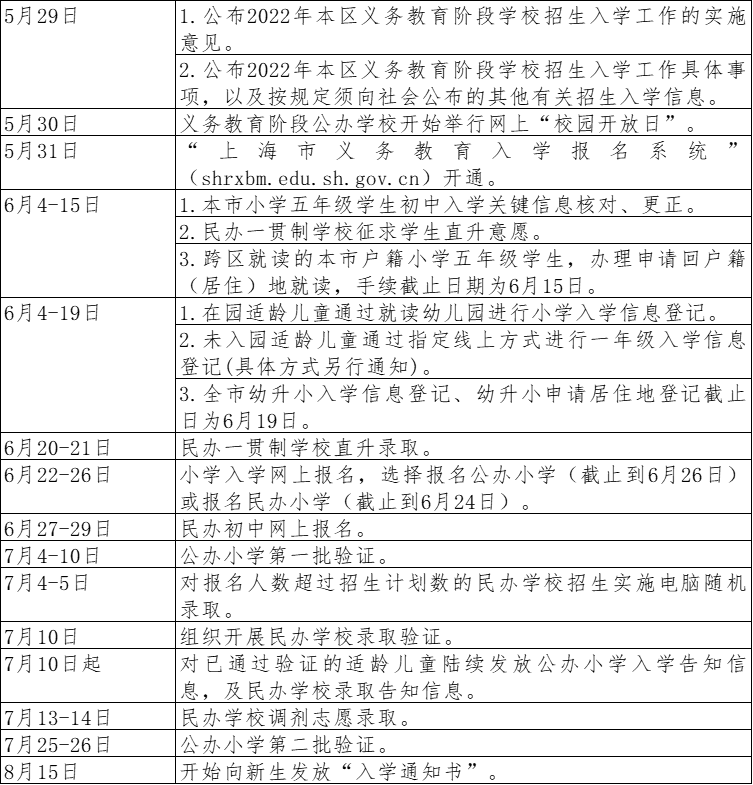 4.7月10日起本市将通过短信和“上海市义务教育入学报名系统”陆续告知相关入学信息。民办学校招生工作完成后,学校将录取名单上报区教育行政部门。学生按学校通知,提供户口簿、父母一方有效的《上海市居住证》《就业失业登记证》、参加本市职工社会保险证明、《本市户籍人户分离人员居住登记(回执)》等证件办理入学手续。